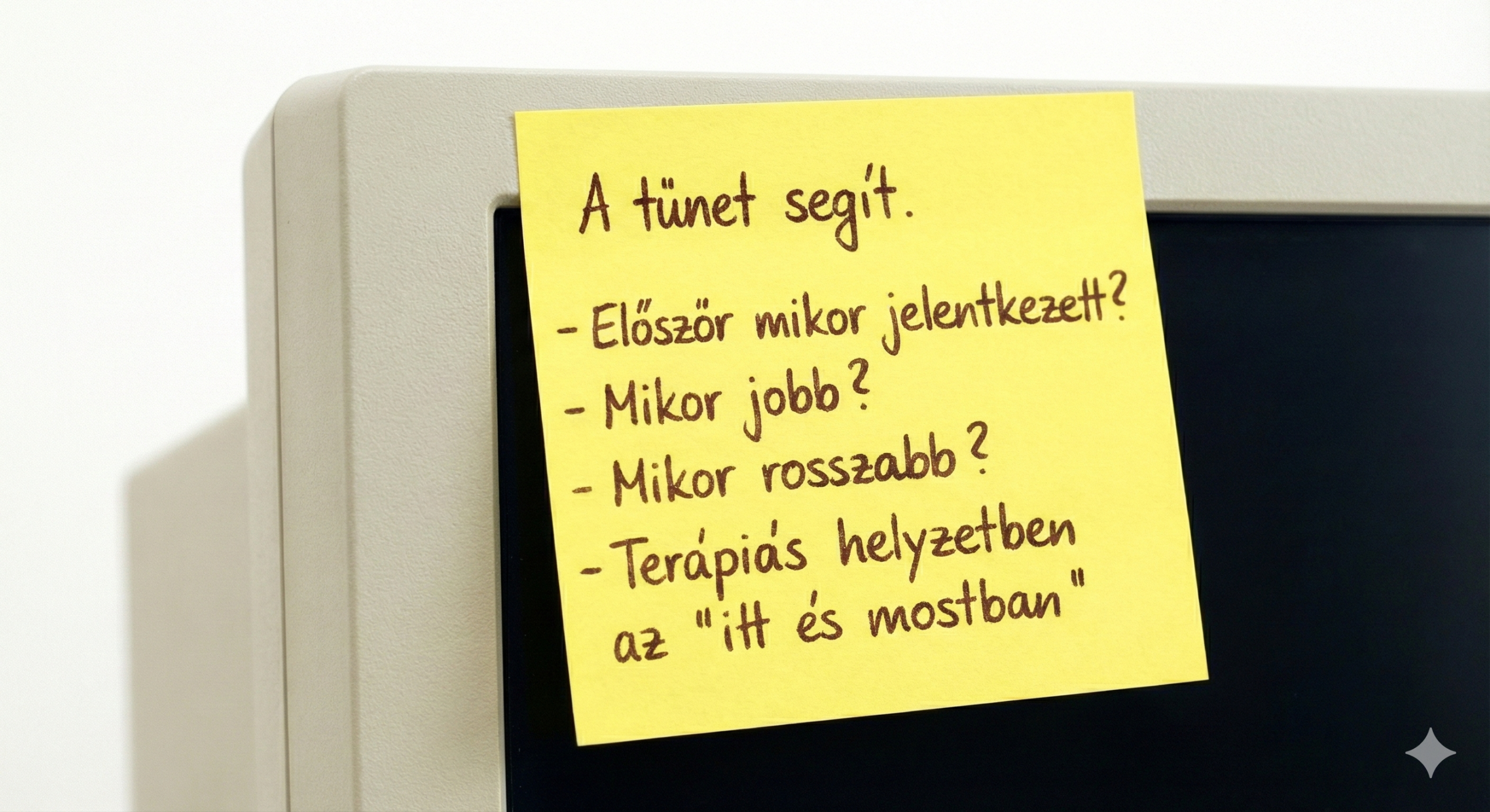 A tünet fontos jelző faktor. Ha pszichoterápiát indítunk, akkor sem feledkezünk el róla, csak nem a tünet csökkentése lesz a célpont. De végig nyomonkövetjük. A tünet segít, beszél hozzánk. Segíthet ha feltérképezzük, hogy mikor indult. Milyen életkörülmények voltak, mi változott akkor meg. Mindig fontos a kezdet, ott valami történt, akkor is, ha látszólag nem egyértelmű az összefüggés. Ahogy nagyon izgalmas az is, amikor a terápiás térben is megjelenik a tünet az “itt és mostban” a beszélgetés közben. Remek lehetőség, hogy élőben foglalkozzunk vele és jobban megértsük.
